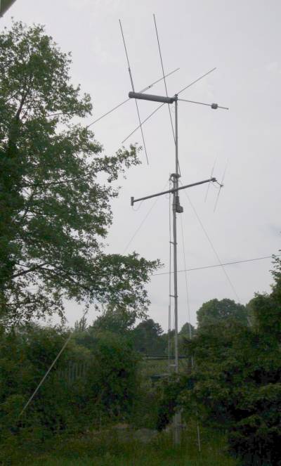 Das Bild zeigt oben die Turnstyle-Antenne für den Empfang der Sender Ipres oder Dourbes im 6m-Band (beide in Belgien). Diese Antenne ist eine Kopie der Sendeantennen. In der Mitte des Mastes ist rechts als Reserve eine kleine HB9CV-2m-Band Antenne zum Empfang des Senders GRAVES (Frankreich) montiert.