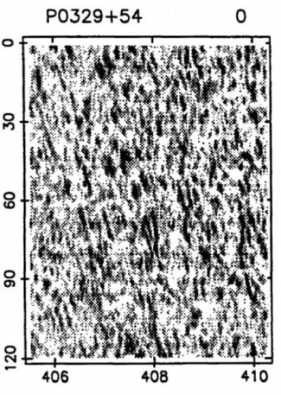 Zu beachten ist weiterhin, dass das Szintillationsverhalten in anderen Frequenzbereichen anders ausfallen kann. Bei niedrigeren Frequenzen spielt sich die Szintillation beim gleichen Pulsar B0329+54 auf sehr viel kleineren Frequenz- und Zeitskalen ab: